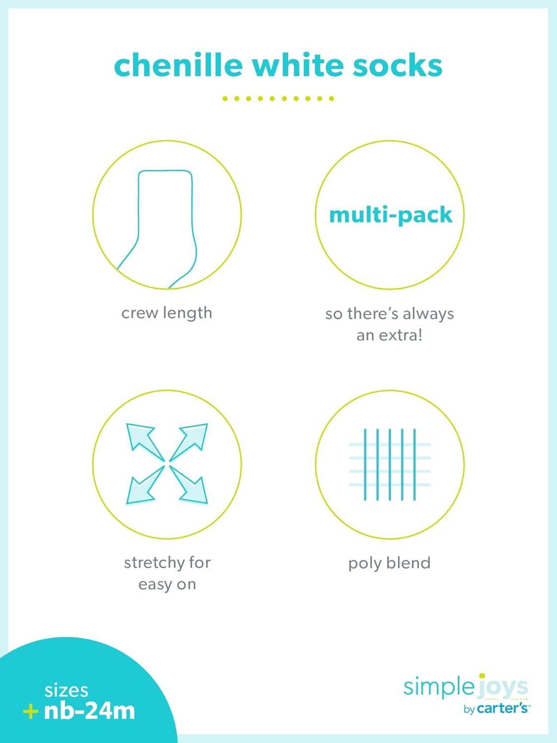 Keep little feet warm and cozy with this adorable 8-pack of chenille socks from Simple Joys by Carter's, designed for comfort and everyday wear. Soft, plush, and gentle on delicate skin, these socks provide a snug yet flexible fit, perfect for wiggly toes. With a mix of sweet colors and classic designs, they’re easy to pair with any outfit. This value pack ensures you always have a fresh pair on hand—whether it’s for daily wear, daycare, or an extra in the diaper bag. Designed with secure stretch cuffs, these socks stay put without feeling too tight, keeping tiny feet comfy all day long. Practical, soft, and oh-so-cute, they’re a must-have for your little one’s wardrobe.