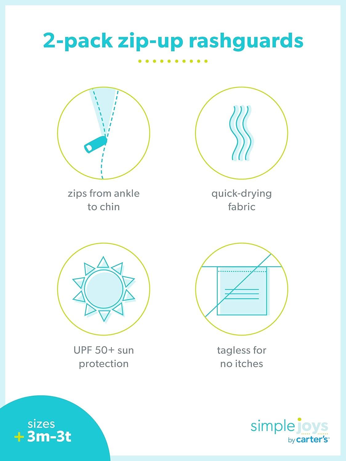 This 2-Pack One-Piece Long Sleeve Zip-Up Rashguard Swimsuit for Boys from Simple Joys by Carter’s combines comfort, protection, and playful style for the ultimate summer gear. Designed with fun, vibrant prints and colors, it will keep your little one excited for every swim. The UPF 50 rating offers excellent sun protection, ensuring that they stay safe from harmful UV rays while enjoying the outdoors. Featuring a full zip closure for easy on-and-off, this swimsuit provides a snug fit with added convenience. The long sleeves provide extra coverage, making it perfect for days at the beach, pool, or any water activity. Whether splashing around or lounging under the sun, this rashguard swimsuit is the ideal choice for active boys who love to make a splash!