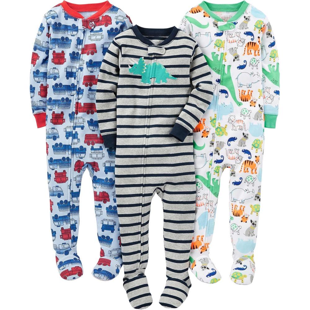 Simple Joys by Carter’s baby-boys 3-pack Snug Fit Footed Cotton Pajamas(Blue Firetruck/Grey Stripe/White Dinosaur)