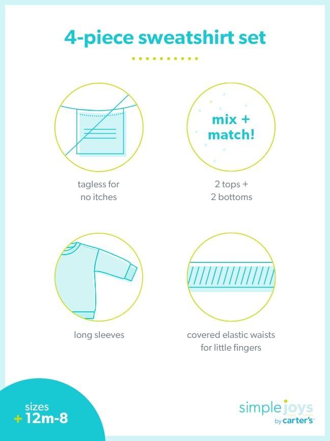 Keep your little one comfy and stylish with this 2-pack 4-piece sweatsuit set from Simple Joys by Carter’s. Perfect for mix-and-match dressing, this set includes two long-sleeve pullovers and two jogger pants with an adjustable drawstring for the perfect fit. Whether it's for school, playdates, or lounging at home, these soft, durable pieces are designed for all-day wear. With two full outfits in one pack, you get twice the value—because great style and comfort shouldn’t break the bank!