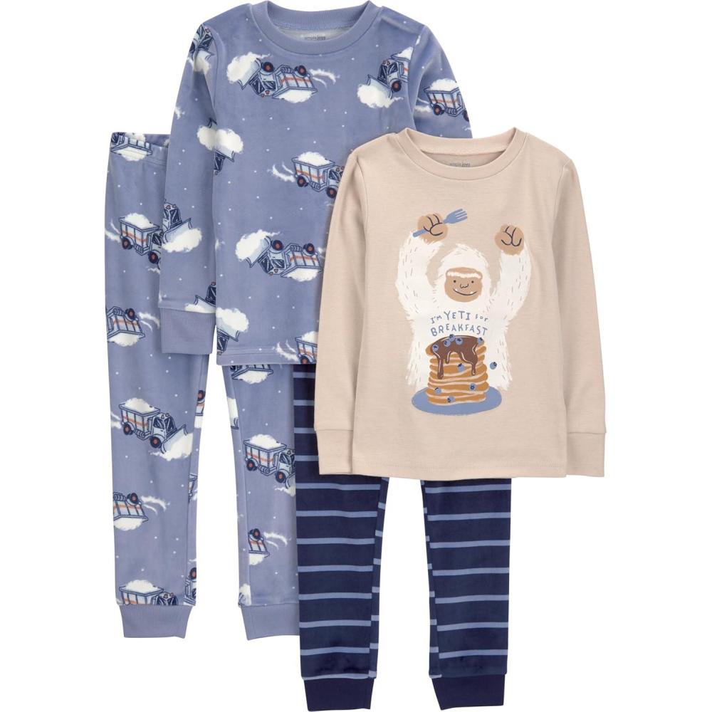 4-Piece pajama set includes 2 long sleeve cotton tops with 2 cozy fleece pants