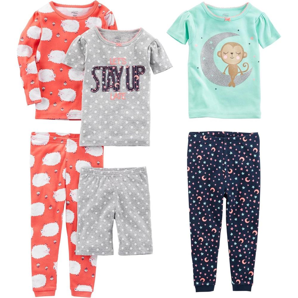 imageSimple Joys by Carters girls 6piece Snug Fit Cotton Pajama SetCoral Orange SheepGreen MonkeyGrey DotsNavy Stars